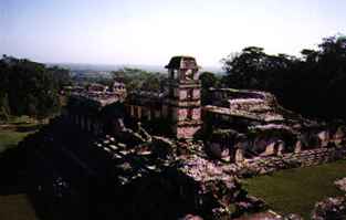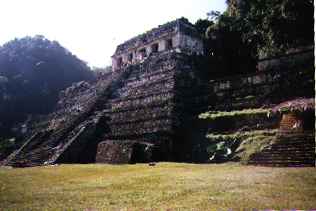 Ah, Palenque. Now we're in Chiapas proper, southernmost state of Mexico. We're up in the mountains (about 2000 m), and it's rain forest all around. In the morning and evenings, (and all night long, for that matter), you can hear the howler monkeys, well, howling. Surrounding these ruins (the ones you can see here) are dozens more, buried and crumbling in the rain forest, with tiny overgrown footpaths connecting them all. Few tourists (of which there are perhaps 400 during the day) venture off the grassy plaza. Also surrounding the hills and farms are thousands upon thousands of hallucinogenic mushrooms, which have become a very lucrative crop for the local farmers. The campgrounds, where you sleep at night, gently swaying in your hammock under a palapa, are alive with, shall we say, somewhat left-thinking individuals who stay for days, weeks - even months. I personally only had four days to spend here... The moon was full one night, I spent several hours among the ruins - a remarkable little stop. |